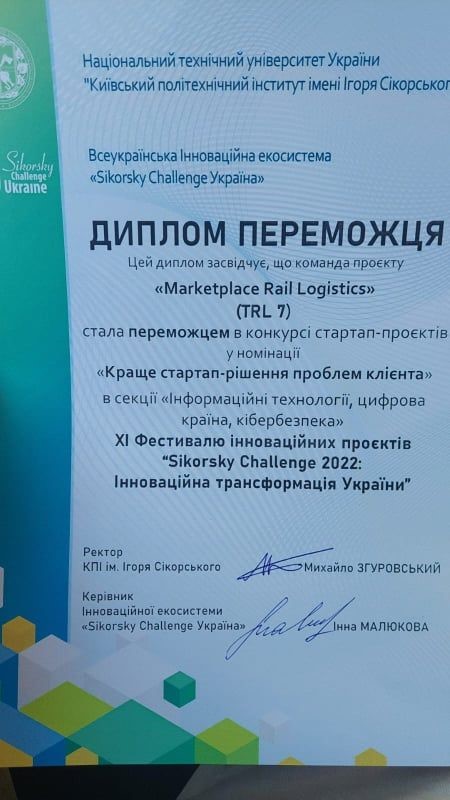 Тому нами було розроблено незалежне альтернативне рішення нової сучасної системи, якої давно потребує ринок споживачів та надавачів послуг у сфері вантажних вагонних перевезень. У листопаді 2021 року ми створили та презентували прототип Marketplace Rail Logistics, який за рік оновлювали та поповнювали. Ми отримали підтримку від трьох профільних асоціацій, голови комітету з питань транспорту Верховної ради України та міністра Міністерства інфраструктури України. У 2022 році ми провели маркетингове дослідження за допомогою Google ADS, перевірили всі гипотези та зрозуміли, що наш продукт дійсно потрібний ринку, а розроблений функціонал зрозумілий.