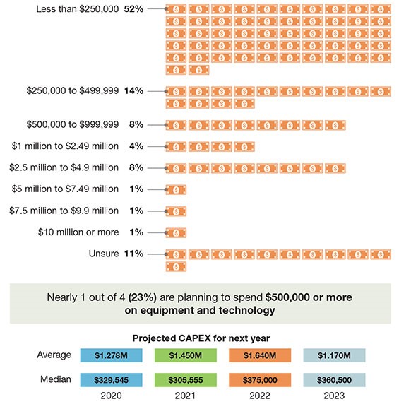 Як згадувалося раніше, прогнозовані капітальні витрати на складське обладнання та технології на наступний рік знизилися. Респонденти заклали середні капітальні витрати на наступний рік у розмірі $1,17 мільйона, порівняно із середнім показником у $1,64 мільйона минулого року.