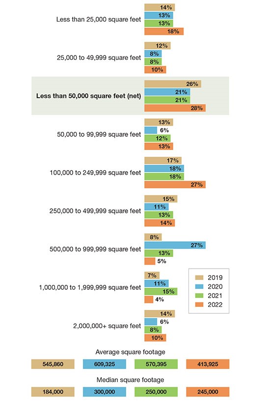 Стосовно загальної кількості квадратних футів у всій мережі розподільчих центрів, то середня площа становила 413 935 кв. футів, що різко знизилося з 570 395 у 2021 році. Однак медіана знизилася лише з 250 000 до 245 000, і цього року кількість респондентів дещо скоротилася, середній річний дохід компанії-респондента знизився зі $120 до $100 мільйонів.