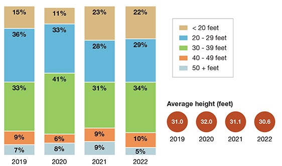 Результати щодо висоти будівель залишилися досить стабільними. Цього року середня корисна висота, враховуючи різні діапазони, становила 30,6 футів (примітка – 9,3 м), що лише трохи нижче торішніх 31,1 футів (9,5 м).
