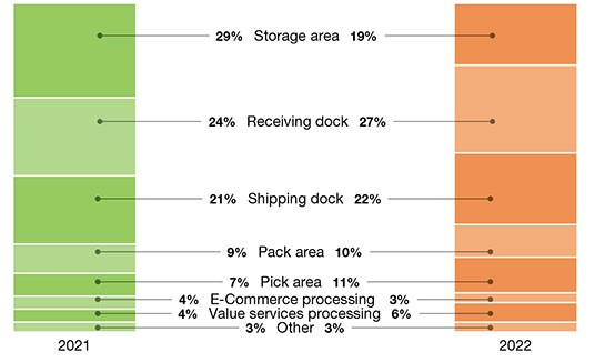 Серед найбільш завантажених зон складу 27% назвали зону приймання. Показник зростає з року в рік: 24% було минулого року, 18% у 2020 році. Збільшилися затори в зоні підбору — з 7% до 11% цього року.