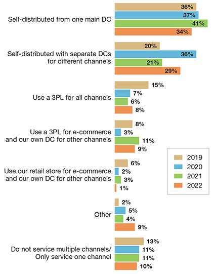 На питання про те, як здійснюється робота з декількома каналами, найбільш поширеною стратегією залишається самовивезення з одного основного розподільчого складу – 34% респондентів. Відсоток респондентів цього року, хто самостійно здійснює дистрибуцію з різних розподільчих центрів за різними каналами, збільшився до 29% порівняно з 21% торік.