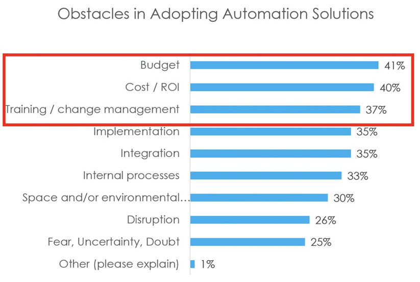 У сьогоднішній нестабільній економіці проблеми видатків займають перше місце в списку перешкод для впровадження рішень автоматизації, причому найбільш значущими є бюджет (41%) і співвідношення витрат і рентабельності інвестицій (40%). Раніше витрати та рентабельність інвестицій також були основними перешкодами для впровадження автоматизації: 54% фахівців з ланцюгів поставок заявили, що це завадило їхнім планам впровадження.