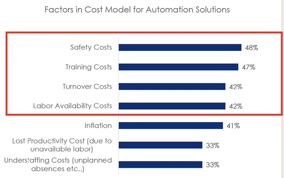 При побудові моделі витрат на рішення для автоматизації компанії найчастіше враховують витрати на безпеку (48%), витрати на навчання (47%), витрати на плинність кадрів (42%) та/або витрати на доступність робочої сили (42%) на додаток до заробітної плати та пільг.