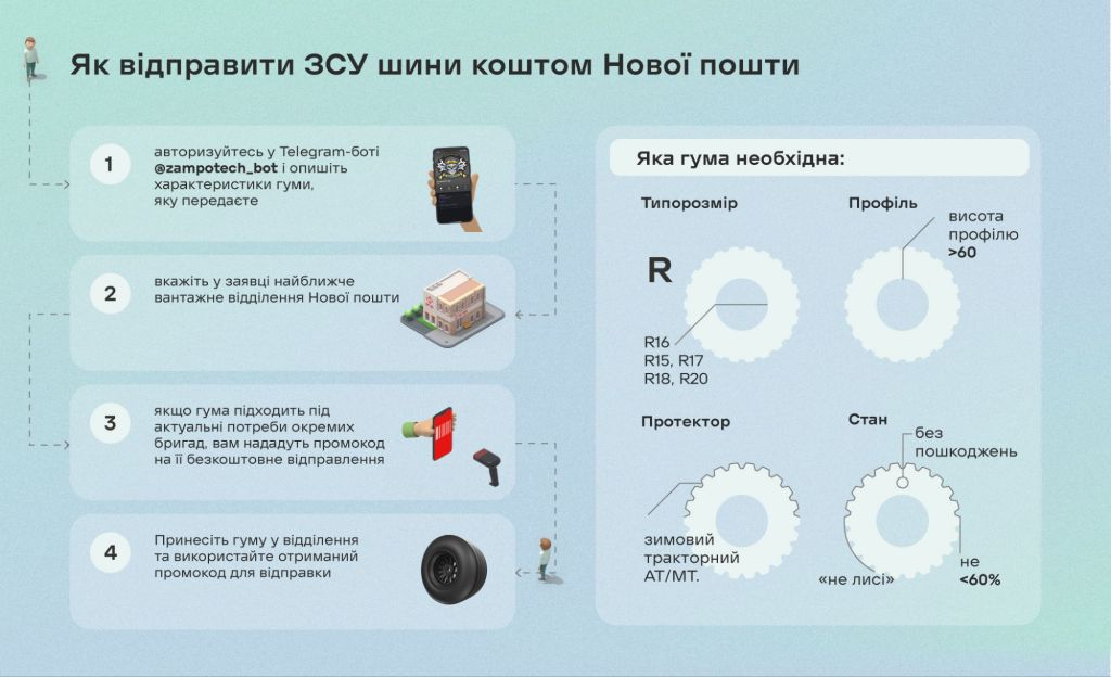 Нова пошта доставлятиме шини власним коштом, а “Зампотех” “взуватиме” авто військових прямо на передовій, організувавши чотири мобільні майстерні. Наразі проєкт організував 2 000 шин для окремих бригад української армії, однак, враховуючи активні бойові дії, такої кількості вистачить щонайбільше на місяць, тож долучайтесь!