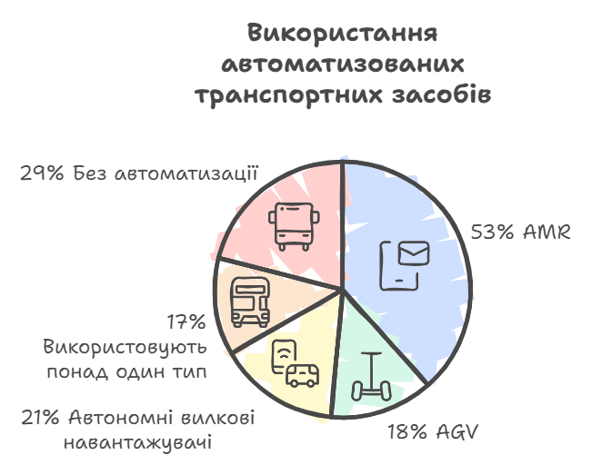 68% застосовують автоматизовані транспортні засоби для переміщення вантажів до або від обладнання, такого як конвеєри, палетайзери або системи AS/RS.