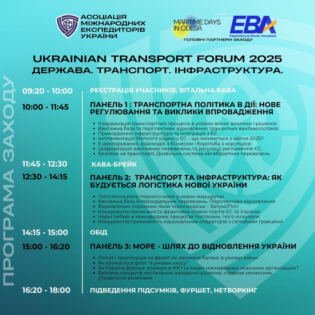 Програма форуму включає три тематичні панелі, присвячені актуальним викликам у сфері транспорту та інфраструктури, цифровізації логістики, міжнародним перевезенням і відновленню